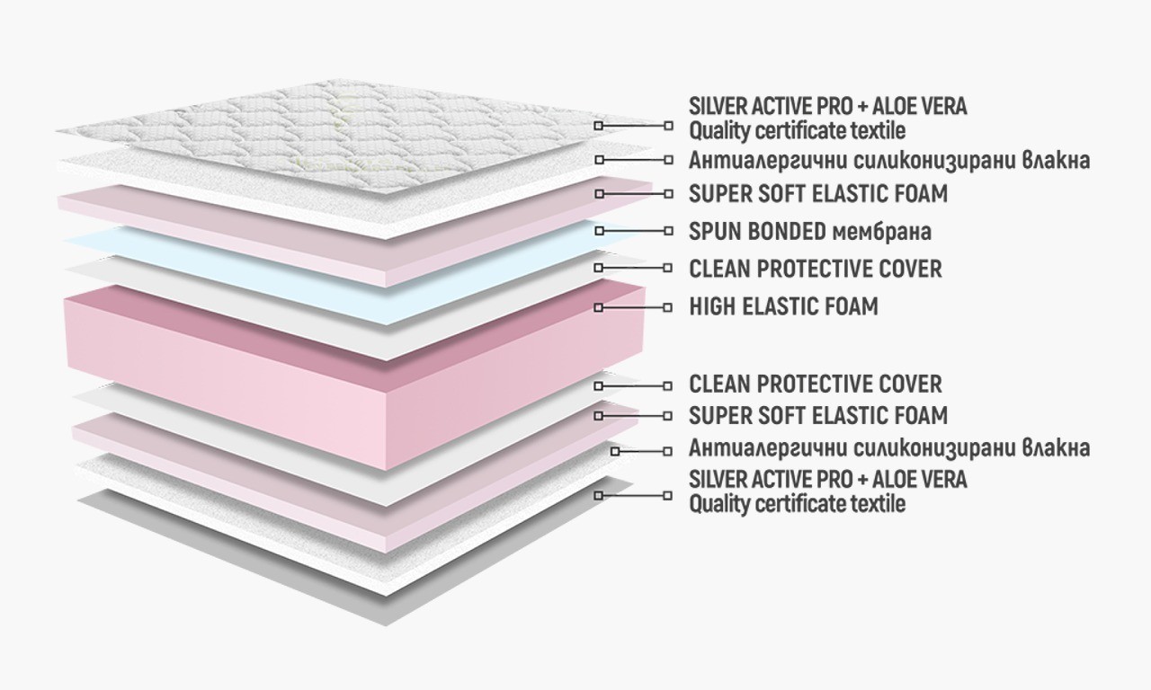 HIGH ELASTIC FOAM предлага необходимата балансирана ортопедичност. За липсата на точки със свръх напрежение, в контактната с тялото зона е добавен SUPER SOFT ELASTIC FOAM. Структурата на сърцевината от „отворени“ клетки и 3D дишаща лента създава оптимална система за максимална проветривост и вентилация на влагата и в дълбочина.