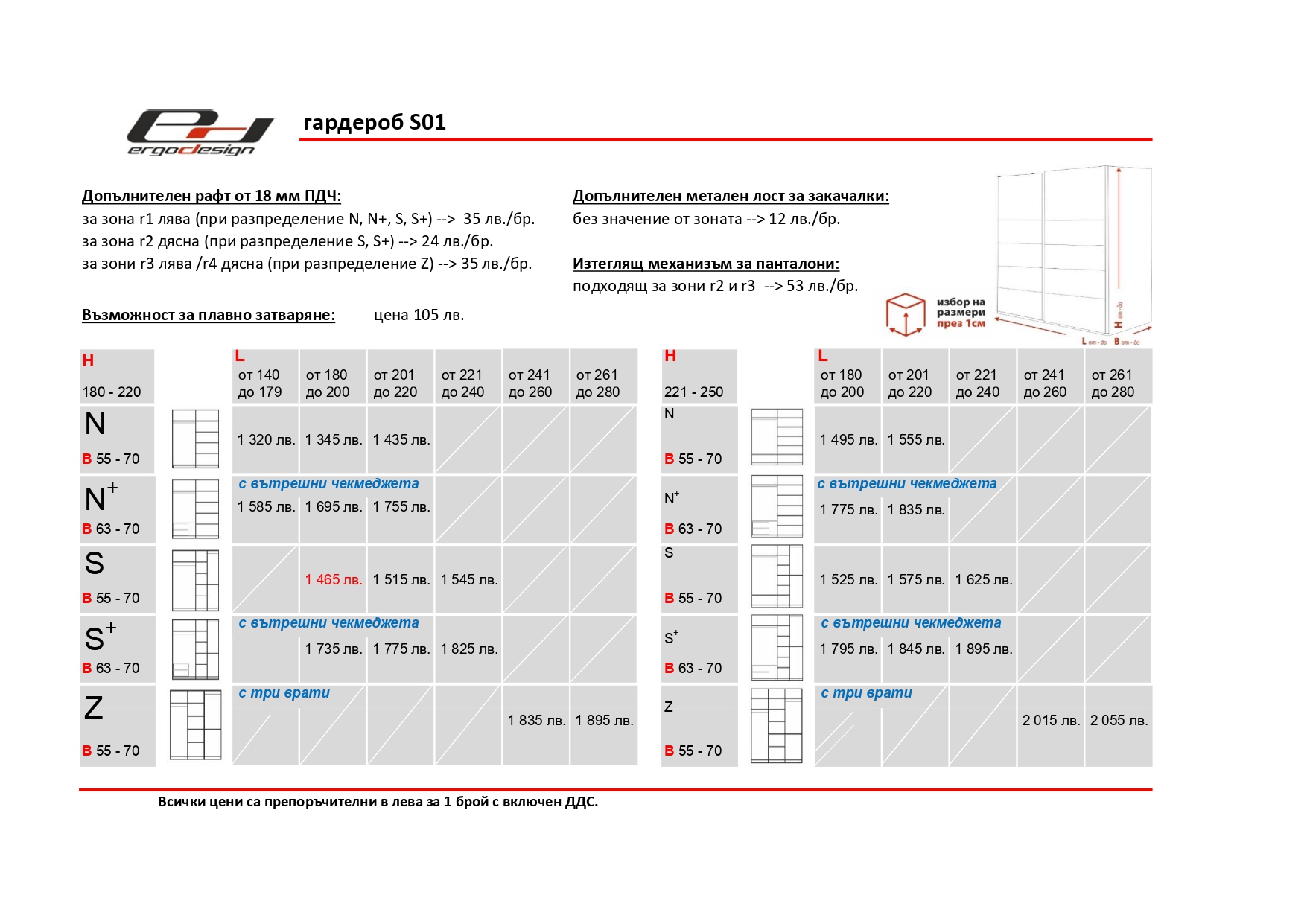 – Опционално към гардероба се предлагат допълнително рафтове и лостове.
