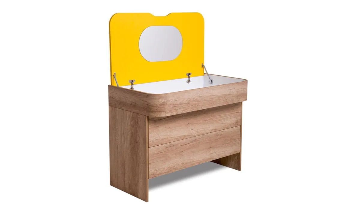 – Сркинът може да се ползва като тоалетка, като при повдигане на плота му се открива огледало и допълнително пространство за съхранение пред него.